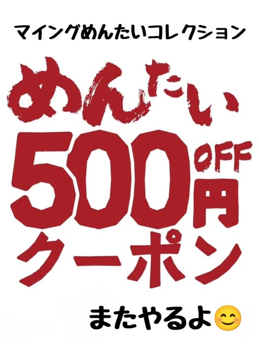 人気の『めんたいコレクションwebクーポン』 人気の「めんたいコレクションwebクーポン」またやります!これまでと同様に、2000円以上のお買い物で500円の値引きです! 明太子以外のお買い物にもご利用頂けます。 10/10から10/19まで、なくなり次第終了です。 ご利用はお早めに。 その他の記事を読む 前の投稿ラグビー部『入荷』 次の投稿【明太フランス始めました】 おすすめ ユニ着ハッピーデー 開催中! 2023年3月8日 3/7より通常営業(9:00〜21:00) 2022年3月5日 ネクスペイ7/30よりご利用できます。 2021年7月29日