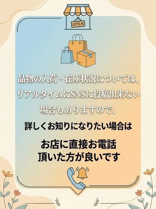 リアルタイムな在庫状況について いつも当店をご愛顧いただき、誠にありがとうございます。 日頃より多くのお客様にご来店いただいており、在庫状況が日々大きく変動しております。そのため、SNSでのリアルタイムな在庫状況の更新が難しい場合がございます。 特定の商品の在庫や入荷について、より詳しく正確にお知りになりたい場合は、お手数ですが、お店に直接お電話(092-451-2623)いただけますと幸いです。 皆様のご来店を、心よりお待ちしております。 その他の記事を読む 前の投稿【味市春香なごみさんの鮭明太/完売御礼!】 次の投稿【入荷速報/明日の祝日分もご用意いたしました!】 おすすめ オリジナルグッズ抽選会 2024年6月28日 スペシャルキャッシュバックキャンペーン 2025年5月2日 ユニ着ハッピーデー 開催中! 2023年3月8日